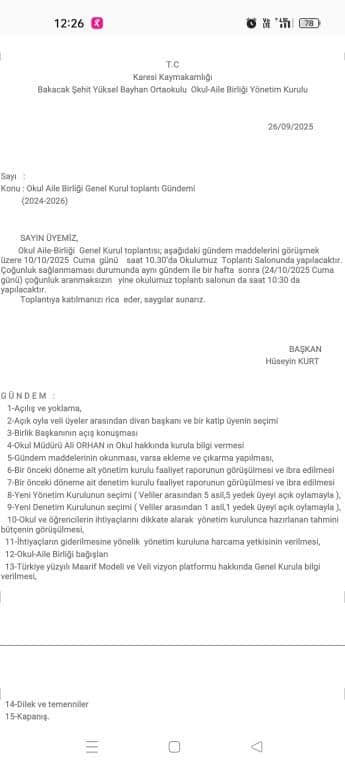10/10/2025 Cuma günü saat 10:30'da Okul Aile Birliği Toplantısı...